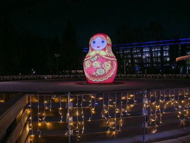 Ледовый каток в парке «Швейцария» открылся для посетителей 1 декабря. Площадку украсили светящейся матрешкой в центре и гирляндами по периметру.