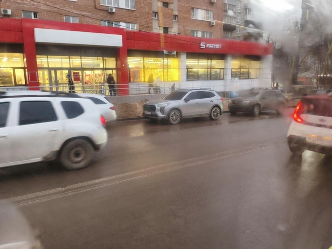 По словам очевидца, несколько машин были припаркованы около дома № 11 по улице Родионова, что заблокировало одну из двух доступных полос. Ранее, до открытия объездной, это место рядом с магазином также часто использовалось для парковки.